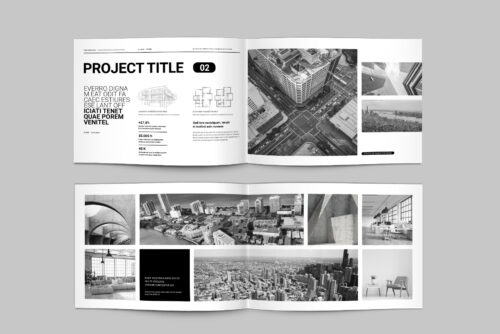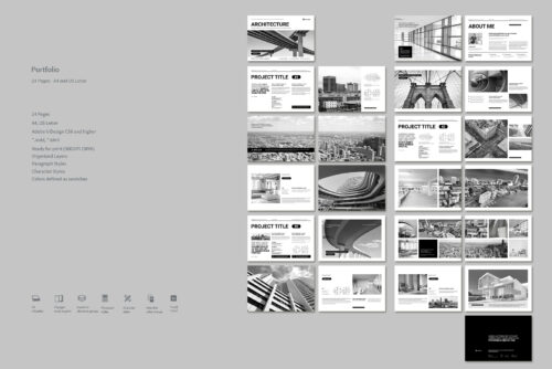 Portfolio or Album Landscape. This is a modern and powerful template for a Portfolio. 24 pages possibility of creating many unique spreads.