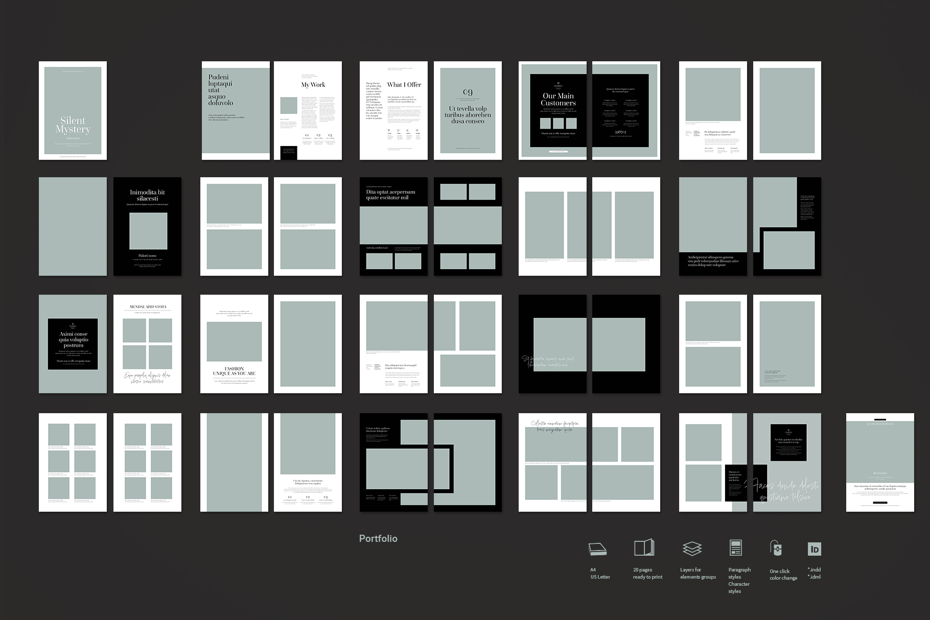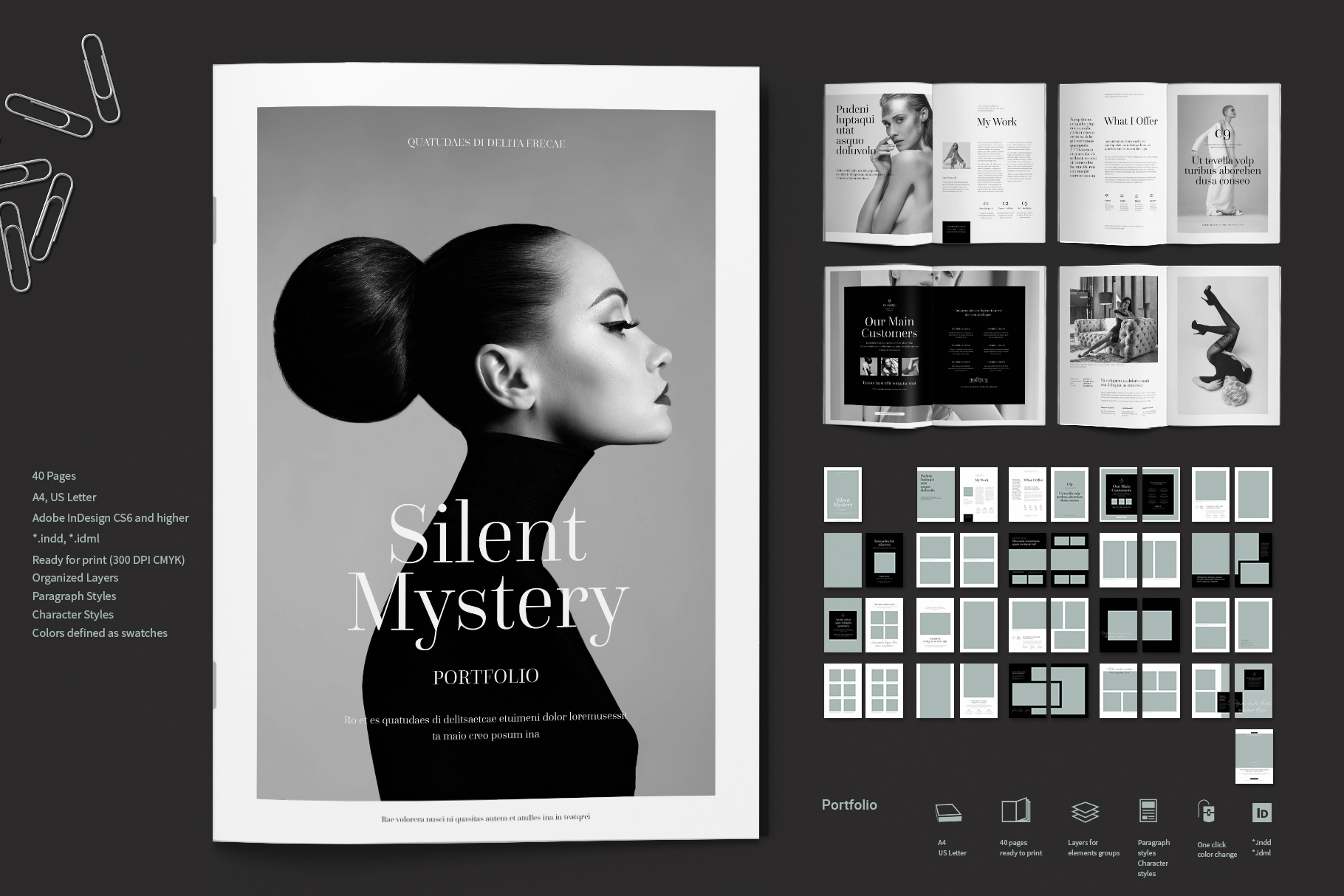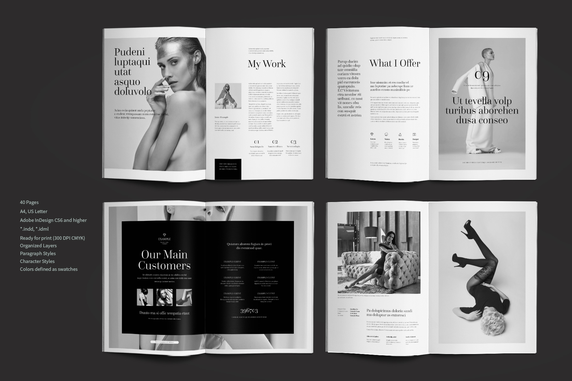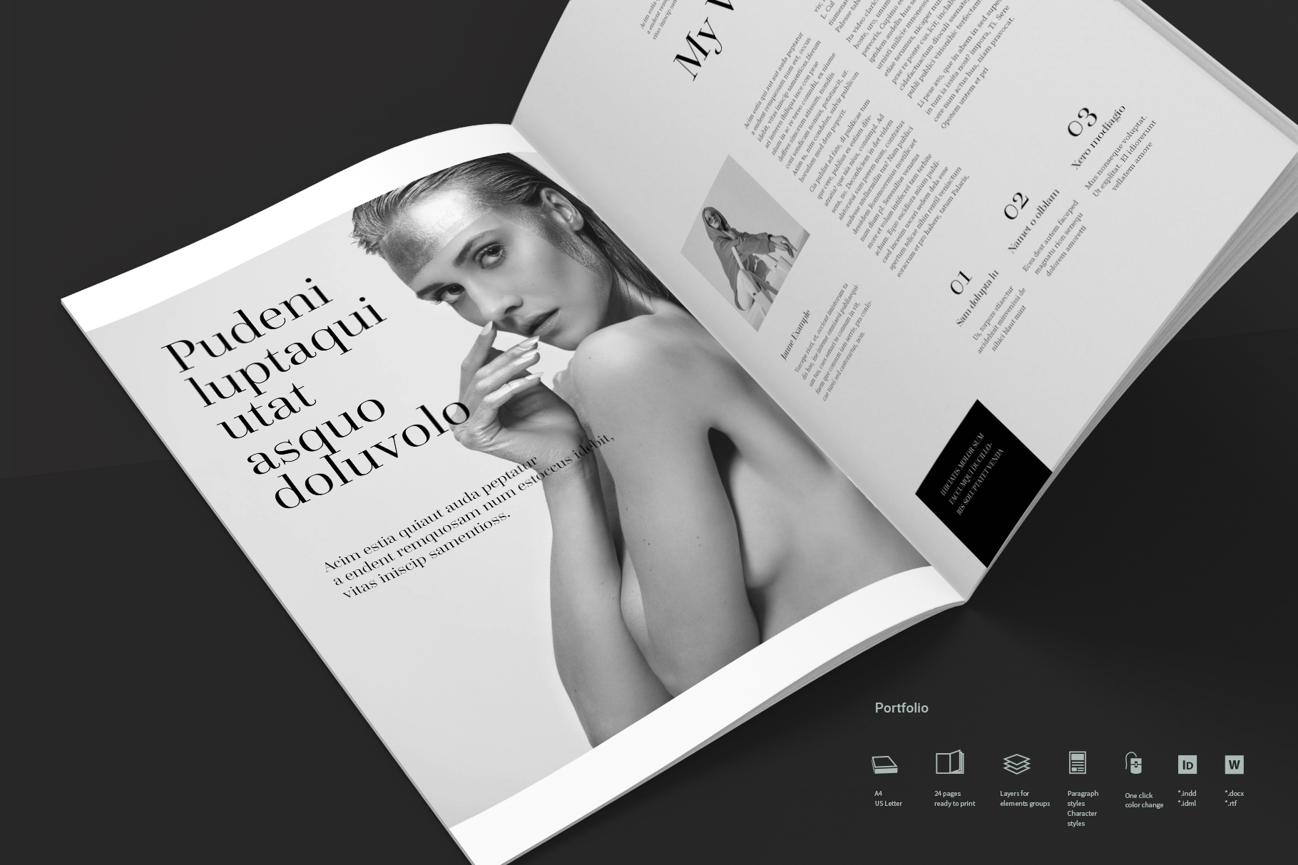 Portfolio or album. This is a modern and powerful template for a Portfolio. 40 pages possibility of creating many unique spreads.